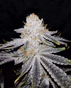 Die Blüten sind optisch ein Highlight: hellgrün bis limettenfarben, mit orangefarbenen Pistillen und lila-pinken Akzenten, überzogen von einer dicken Schicht milchig-weißer Trichome – von den Buds bis zu den Fächerblättern. 🌿 Dieser frostige Auftritt ist kein Zufall, sondern Ausdruck der außergewöhnlichen Potenz und Harzproduktion dieser Sorte.